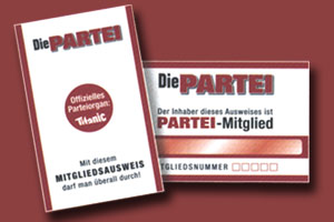 Der Mitgliedsausweis ist in den markanten Farben Rot und Weiß gehalten und trägt stolz den Schriftzug „Der Inhaber dieses Ausweises ist PARTEI-Mitglied“. Was gibt es Schöneres?