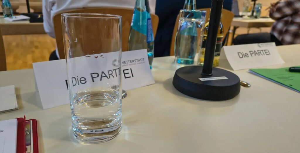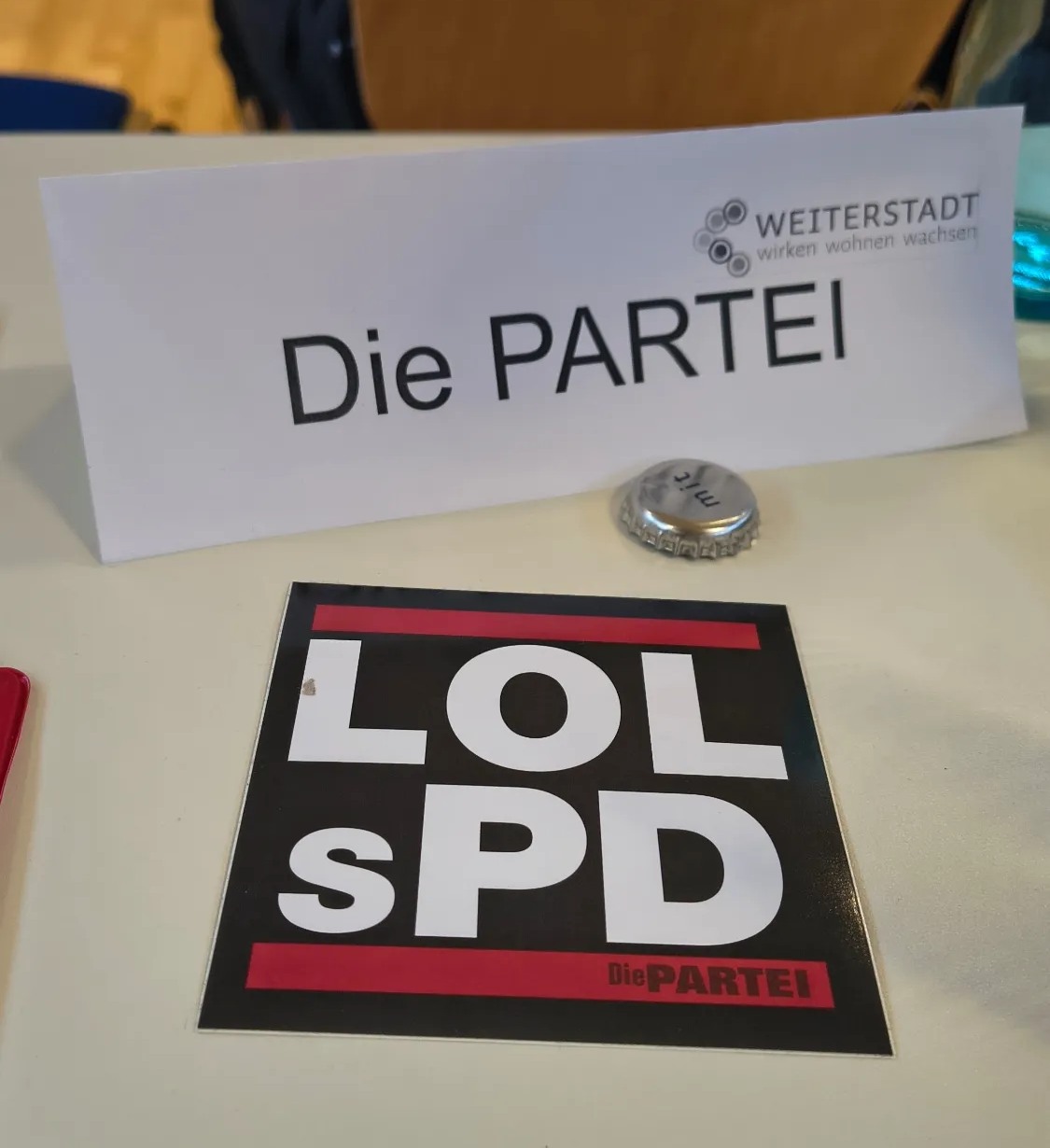 Heute am Tag des Bieres (23. April 2026) findet die konstituierende Sitzung der Stadtverordnetenversammlung Weiterstadt statt. Die sehr gute Die PARTEI-Fraktion (zwei Abgeordnete) sitzt als die Partei der extremen Mitte zwar exakt in der Mitte des Sitzungssaales; wir sind aber nur in einer Stadtverordnung der Rechten.