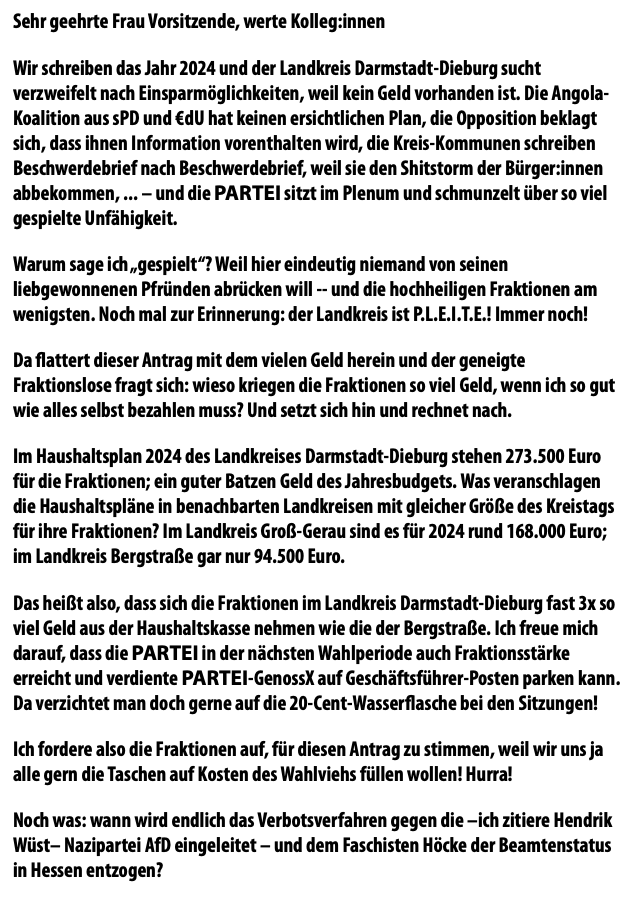 Weiterlesen →Anm.: bei den Zahlen zum Landkreis Bergstraße ist mir ein Fehler unterlaufen. Dort bekommen die Fraktionen lt. Haushaltsplan im Jahre 2024 insgesamt 138.500 Euro und nicht, wie in der Rede erwähnt, 94.500 Euro. Das ist trotzdem immer noch nur die Hälfte von dem, was Fraktionen im LaDaDi sich genehmigen.