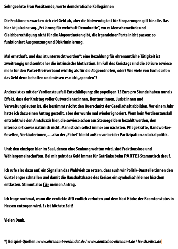 Freitag Nachmittag schneit mir über das Kreistagsbüro ein „Dringlichkeitsantrag“ ins Mailfach. Auf Initiative der GrüNee wollen die sog. „Fraktionen“ in der Kreistagssitzung irgendeine Erklärung gegen rechts verabschieden. Ich lese Gefasel von „Demokratie“, „Toleranz“ und „Gleichberechtigung“ und frage mich, ob diese Werte nur für Auserwählte wie „Fraktionen“ gelten und nicht für fraktionslose Kreistagsabgeordnete, die weder von der Initiative wissen noch überhaupt berücksichtigt werden. Mein PARTEI-Team und ich schreiben eine Pressemitteilung, um auszudrücken, was wir vom selbstgefälligen Pharisäertum der „demokratischen Parteien“ halten und weisen darauf hin, dass die Demonstrationen gegen rechts, für die mittlerweile hunderttausende auf die Straßen gehen, sich auch gegen Tatenlosigkeit und z.T. Unterstützung von rechter Demokratiefeindlichkeit durch „Demokraten“* wenden.