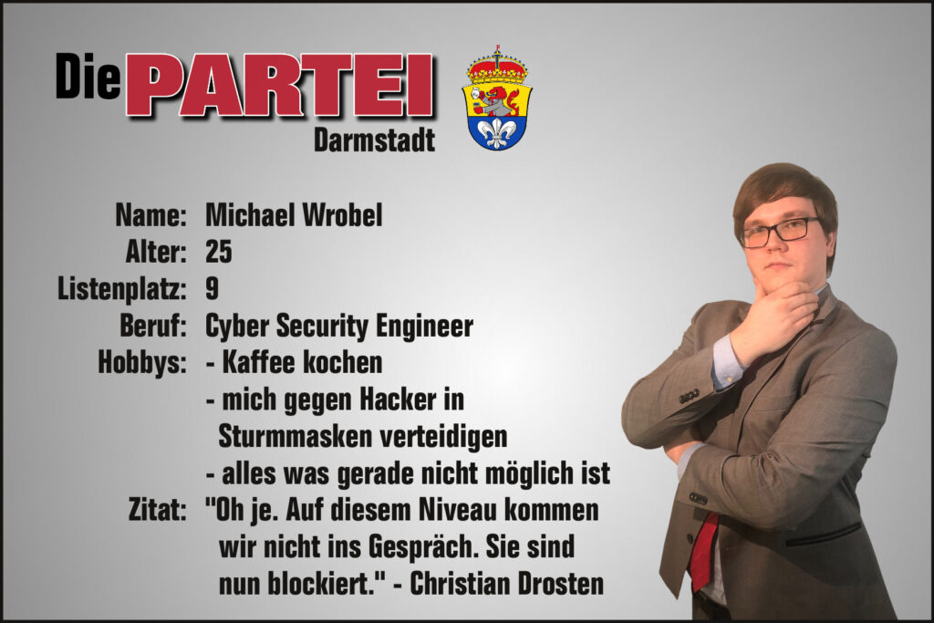 Heute stellen wir euch unseren Kandidaten für den neunten Listenplatz vor. Mit ihm bekommt die Stadtverordnetenversammlung eine Expertise in Cybersicherheit, auf die sogar der Bundestag neidisch ist- der sehr gute Michael Wrobel.