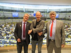 Von links: Thomas Baier mit Martin Sonneborn & Torsten Kobelt im Dezember 2016 im Europa-Parlament in Brüssel