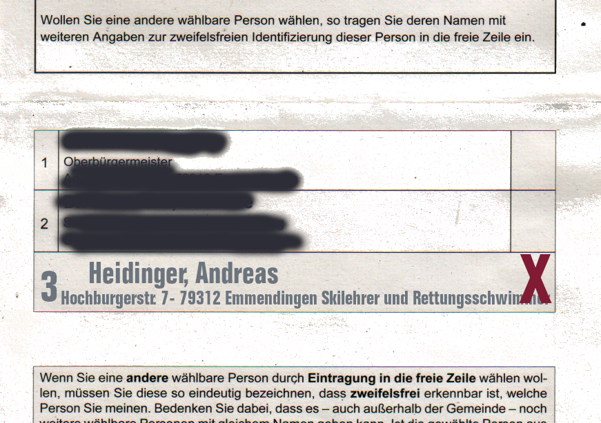 nach eingehender Prüfung der uns unaufgefordert zugesandten Briefwahlunterlagen für die OB-Wahl der Großen Kreisstadt Emmendingen für den 24.05. ist uns aufgefallen: Es fehlt einfach eine gute Kandidatur, deswegen unser Wahlvorschlag für Sie: