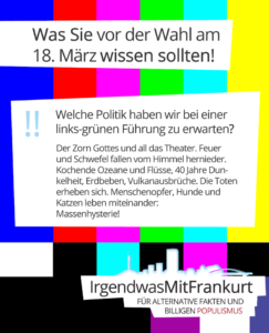 Das Frankurter Bürger Bündnis (kein Rechtschreibfehler) gibt sich die Ehre und fährt jetzt richtig harte Geschütze auf. Mückenplagen, Fahrverbote und alles wird teurer! René Wilke wird bestimmt auch die Rote Armee in Frankurt auferstehen lassen und bald rollen wieder T-34 Panzer durch die Stadt.