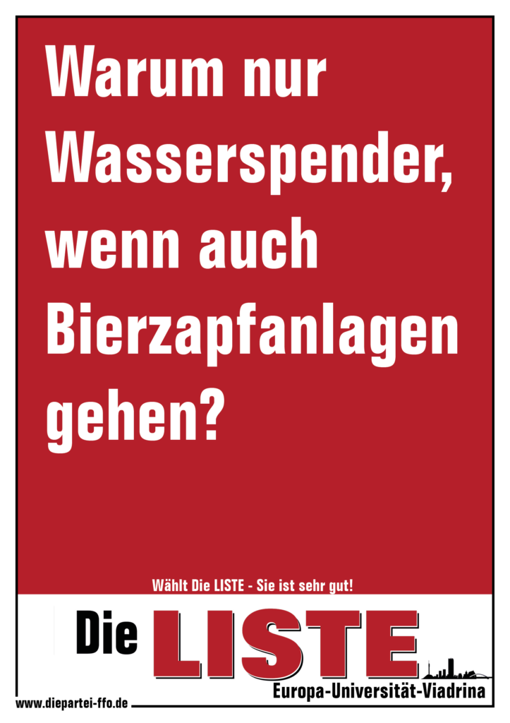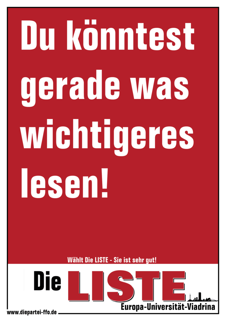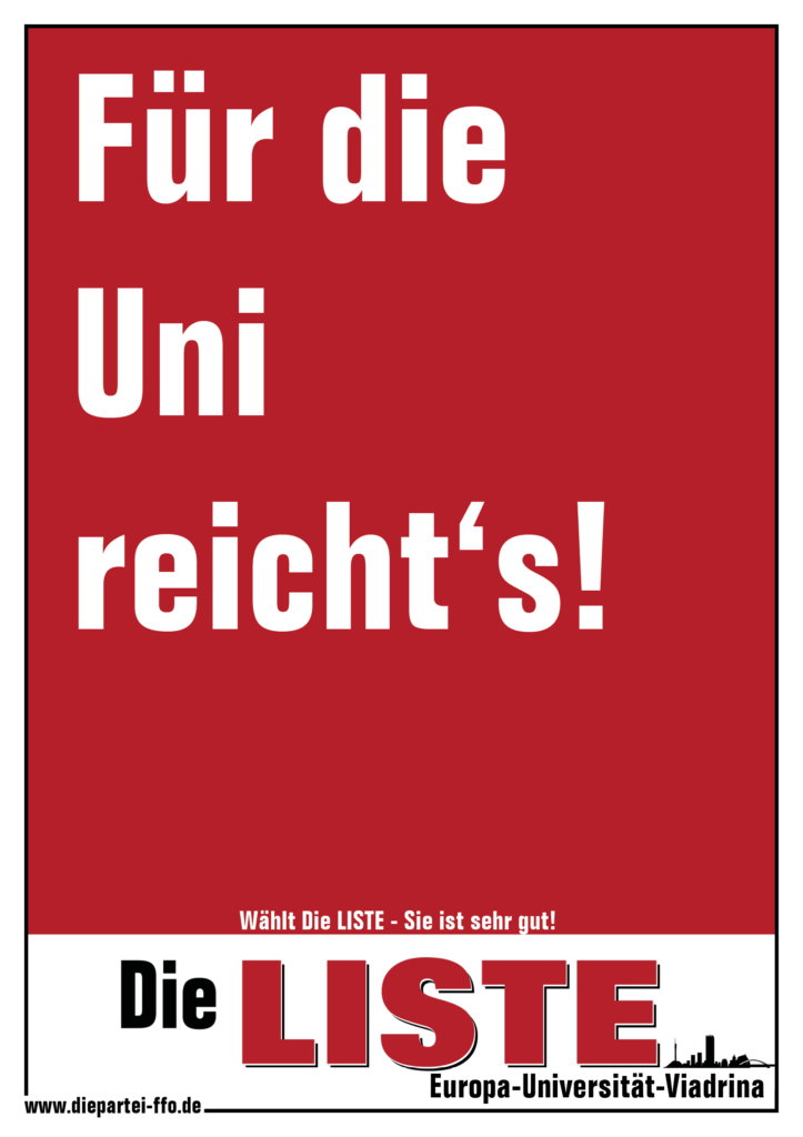 Die LISTE an der Viadrina ist die soziale Alternative zur Juso HSG, die ökologische Alternative zu CampusGrün, die einzig wahre Liste für…, die rechte Alternative zu #noViaF, die linke Alternative zum SDS, die moderne Alternative zu L.E.G.I.S., die christliche Alternative zum eRCeDeS und natürlich die einzig wahre Hochschulgruppe.