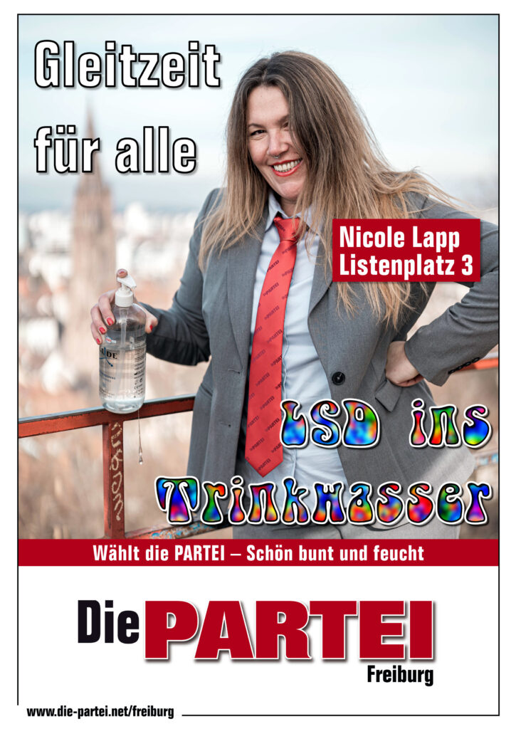 „Hallo Freiburg! Auf dem schönen Listenplatz 3 der noch viel schöneren Partei Die PARTEI habe ich meinen Platz gefunden und trete für euch zur Kommunalwahl am 09.06. an!