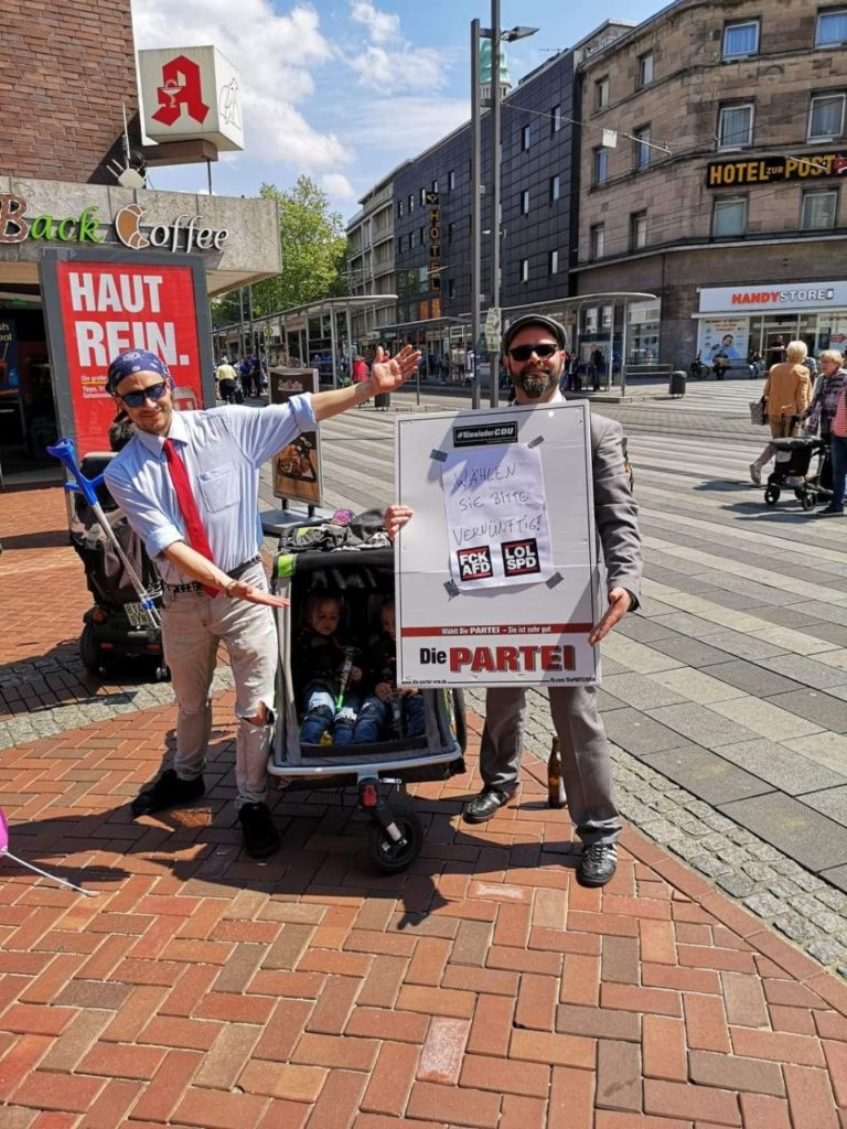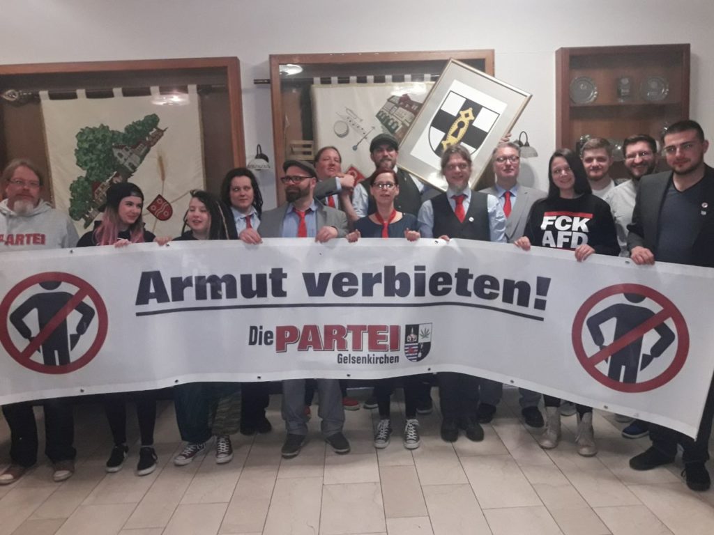 Wir sind bereits auch bundesweit aktiv. Die sehr gute Partei Die PARTEI ist die einzige Partei, die einen gesetzlichen Entwurf zum Verbot von Armut in der Tasche hat. Wir finden, es kann nicht angehen, dass 8 Menschen dieser Republik die Hälfte des Vermögens besitzt. Nehmen wir endlich unser Grundgesetz ernst: Eigentum verpflichtet. – Deshalb: Wählen Sie die PARTEI, denn sie verteilt gerecht! Armut muss verboten werden.