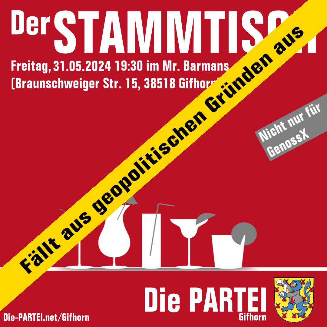 am 28. Februar 2025 ab 19:30 Uhr versammelt sich der Kreisverband Die PARTEI Gifhorn zum großen, wichtigen, historischen, aber vor allem öffentlichen Stammtisch! 🎉
