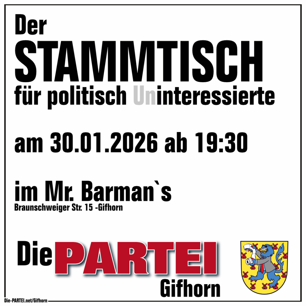 Am kommenden Freitag lädt der Kreisverband Die PARTEI Gifhorn wieder zum gemütlich-ernsten Stammtisch ein.