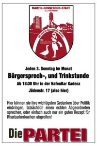 Hurra! Kommenden Sonntag, also am 23. April findet wieder unser allseits beliebter Stammtisch ab 18:30 Uhr in der Hafenbar Kadenz (Jüdenstraße 17) statt (ausnahmsweise mal nicht am 3., sondern am 4. Sonntag des Monats).