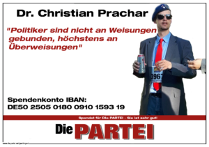 Es ist in der Politik leider nicht anders als sonst im Leben: Geld ist nicht alles – aber ohne Geld ist alles nichts! Diese einfache Weisheit bewahrheitet sich in Zeiten des Wahlkampfes einmal mehr. Durch die anstehende Bundestagswahl in diesem September und die niedersächsische Landtagswahl im Januar 2018 ist auch die sehr gute PARTEI gezwungen, Geld in die Hand zu nehmen. Nicht, weil sie das gerne tut – sondern weil es sich nicht vermeiden lässt (Plakate, Veranstaltungen und sonstige Wahlkampfmaterialien kosten Geld).