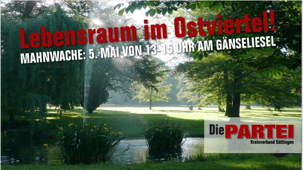 Die PARTEI Göttingen lädt daher an dieser Thematik Interessierte und auch Betroffene ein am Samstag, 5. Mai ab 13 Uhr die Mahnwache am Gänseliesel zu besuchen und dort eigene Verfahrensvorschläge für das Ostviertel einzubringen. Es wird ebenfalls eine Möglichkeit zur Andacht für die gescheiterte Politik der Stadt geben.