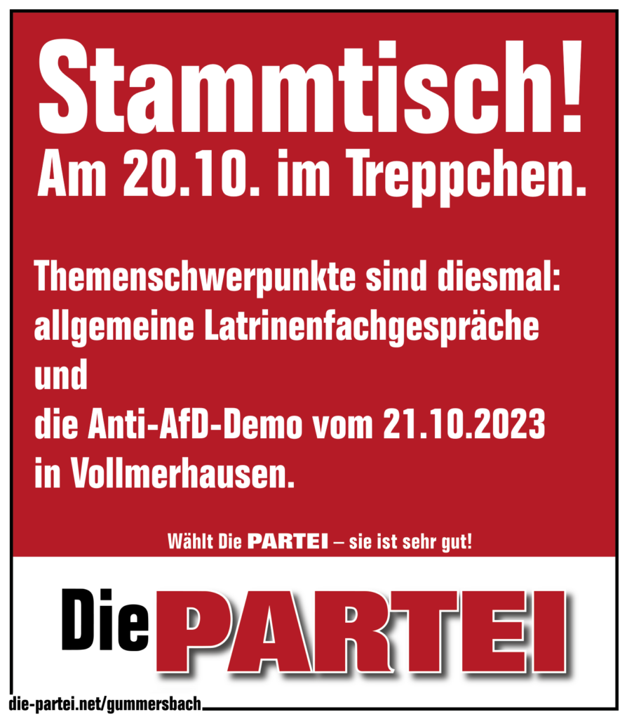 Bald ist es so weit. Unser Stammtisch der Partei Die PARTEI Gummersbach findet statt.