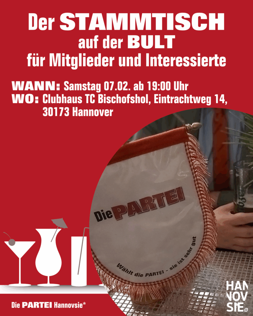Unser Stammtisch im Februar findet wie gewohnt am ersten Samstag im Monat statt, doch Obacht: aus guten organisatorischen Gründen (und weil es dort auch sehr gut ist) sind wir diesmal außer der Reihe im Stadtteil Bult.