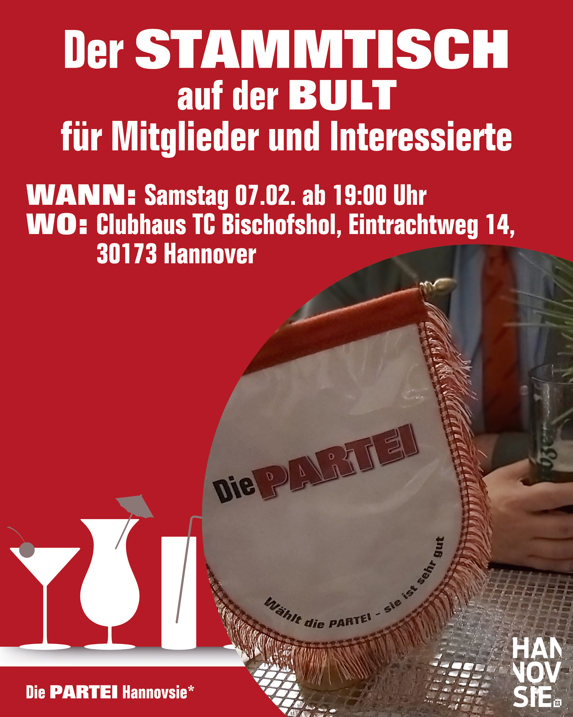 Ihr findet uns zur gewohnten Uhrzeit ab 19 Uhr hier: Clubhaus/Gaststätte TC Bischofshol, Eintrachtweg 14, 30173 Hannover.