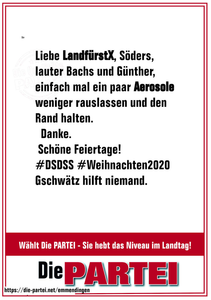 wir brauchen mal noch nebenbei schnell 150 Unterstützungsunterschriften für die politische Karriere unserer 2 Stadträte im Kreis zur Teilnahme an der Landtagswahl 2021 für unsere sehr gute Turbopolitik. Unser Formular gibt es hier, beidseitig ausdrucken, ausfüllen und ab zurück an uns (nur per Post an den Kreisverband), oder dieses Formular ausfüllen, unter Angabe einer Kontaktmöglichkeit: