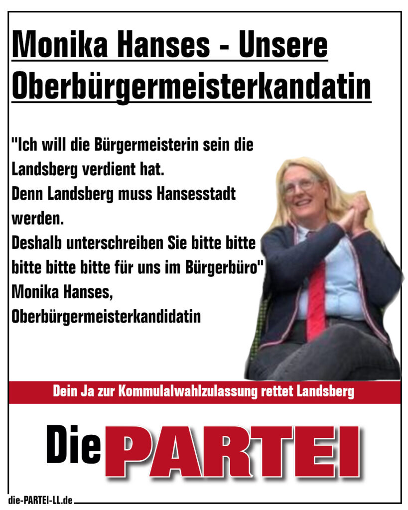 Jaha, der 8.3.2026 mag noch fern sein, doch für das Wahlvolk ist uns keine Werbung zu schade! Hiermit präsentieren wir die beste OB Kandidatin die Die PARTEI Landsberg je hatte! Freuen Sie sich auf eine glorreiche Zukunft mit Zukunft!