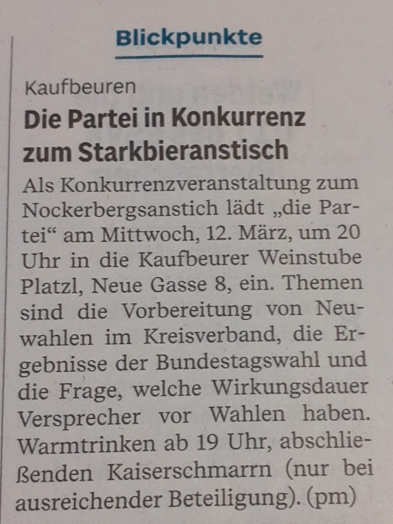 Seit diesem Jahr haben der Kreisverband Ostallgäu und der Kreisverband Kaufbeuren ihren Stammtisch fusioniert. Dieser findet nun immer am ersten Mittwoch im Monat ab 19:00 Uhr in der Weinstube Platzl, Neue Gasse 8, 87600 Kaufbeuren, statt.