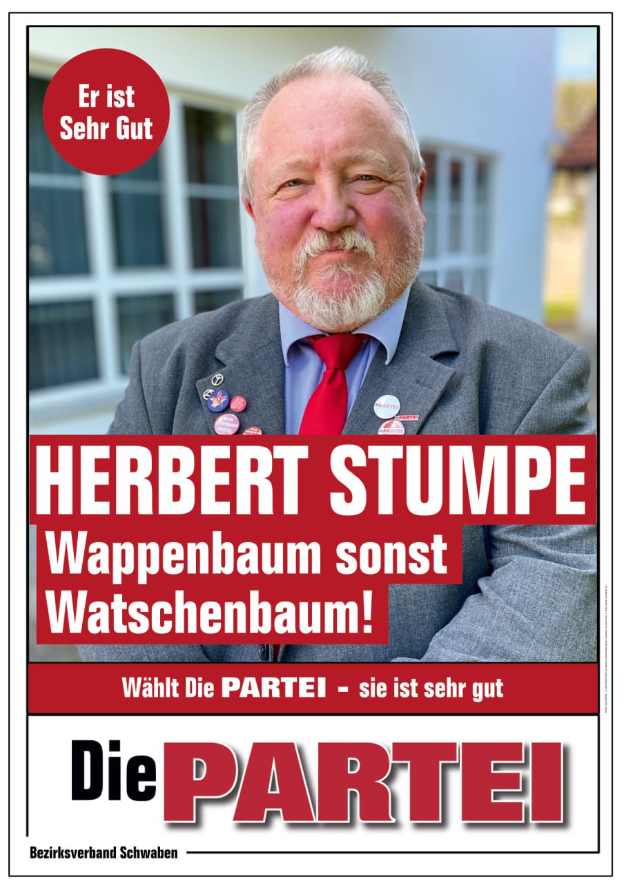 In Kooperation mit dem sehr guten Kreisverband Kaufbeuren, möchten wir noch unsere Wahlgefährten von Kaufbeuren vorstellen. Dort geht nämlich unser PARTEI-Urgestein Herbert Stumpe ins Rennen. Seine weißen Haare spiegeln seine Weisheit wieder und ebenso seine Reinheit.
