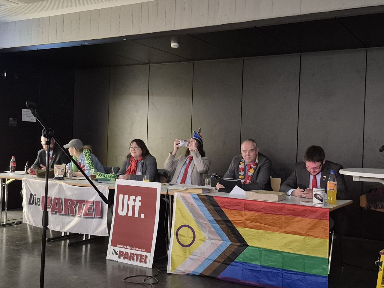 Letzten Samstag, am 18. Oktober 2025, fand der ordentliche LandesPARTEItag des Landesverbands Rheinland-Pfalz in Koblenz im Bürgerzentrum Lützel statt. Geleitet wurde die Versammlung mit eiserner Hand und schlechtem Namensgedächtnis von der da noch stellvertretenden Landesvorstandsvorsitzenden Daniela Zaun. Diese verabschiedete sich aus dem Landesverband RLP mit einer mitreißenden Gesangseinlage und dem Song „My Way“ von Franz Sinestro, um umzugsbedingt nun den Landesverband Hessen unsicher zu machen („Buuh, Hessen!“). Hiernach überreichte ihr der da noch Landesvorsitzende Kevin Wilhelm im Namen des ganzen Landesvorstands „einen hodensackförmigen Stoffbeutel“ voller Krimskrams und Alkohol, um sich für Danielas herausragendes Engagement für die PARTEI RLP zu bedanken und ihr eine strahlende Zukunft in Dings zu wünschen.