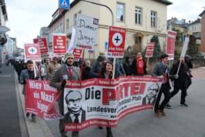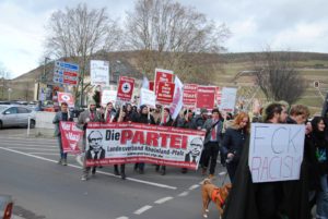 „[…] Mit dabei eine größere Fraktion von Mitgliedern der Satirepartei „Die Partei“, die aus ganz RheinlandPfalz angereist waren. Deshalb prägten bissige Slogans wie „Der Storch bringt die Kinder – die Storch bringt sie um“ das Bild der Demo. Aber auch einfache Sprüche wie „Love is better than hate“ waren auf Transparenten zu lesen. […]“