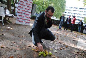 Eigens zum 111. Todestag Helmut Kohls und dem Gedenken an ein geteiltes Deutschland errichtet: unser Denkmal der Teilbarkeit. Mathematisch legitimiert und aus feinsten, heimischen Helmut-Kohl-Früchten, erinnert diese Skulptur an einen Grabhügel, wie man ihn zu Zeiten vor der großen „Entmauerung“ keltischen Herrscherfiguren zuteil werden ließ. Auf dass eines Tages blühende Landschaften daraus hervorgehen mögen, von denen wir alle satt werden – oder zumindest die Schüler des Rabanus-Maurus-Gymnasiums in Mainz.