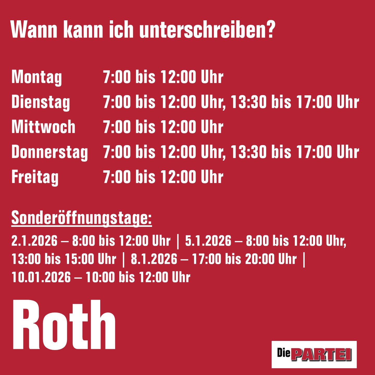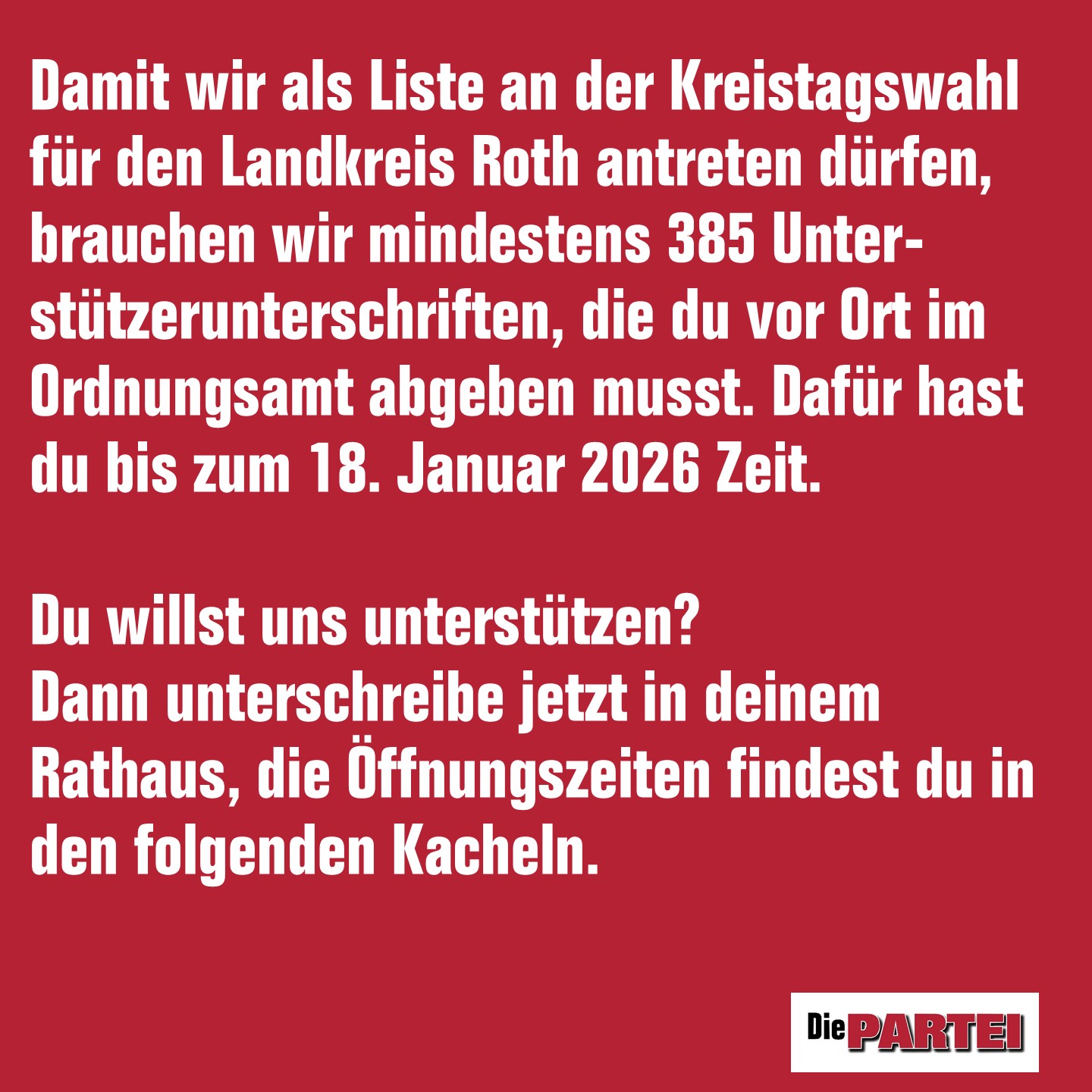 dabei nicht nur Stadtrat und Bürgermeister, sondern auch der Kreistag. Der Kreisverband Roth der Partei Die PARTEI stellte deshalb bei seiner Aufstellungsversammlung am 16.08.2025 nicht nur eine 12-köpfige Liste für den Rother Stadtrat auf (siehe Pressemitteilung vom 12.10.2025), sondern auch eine – sogar noch längere, ebenso hochkarätig besetzte – Kreistagsliste. Angeführt wird sie vom 1. Kreisvorsitzenden Luis Bernreuther aus Georgensgmünd, der sich, für die PARTEI typisch satirisch, (wahl-)kampfbereit zeigt: