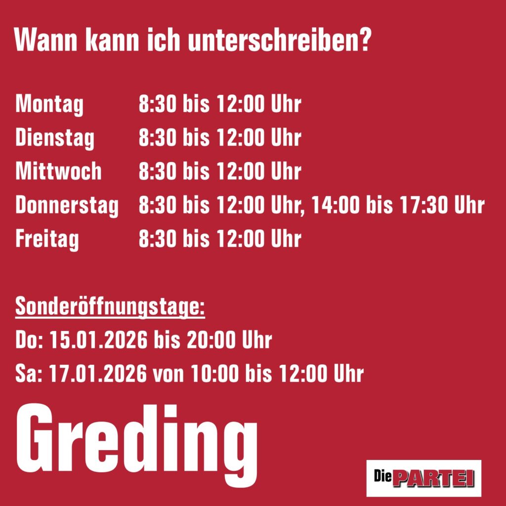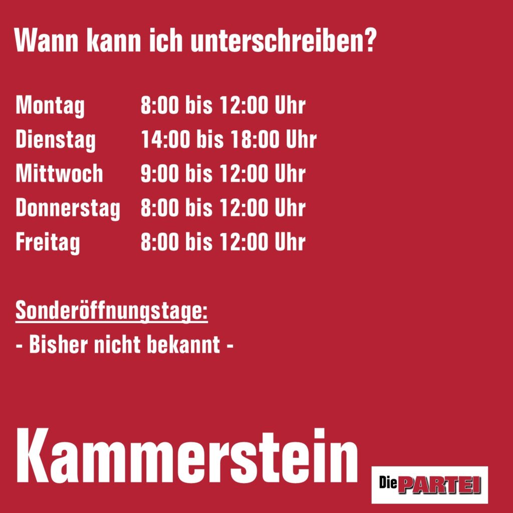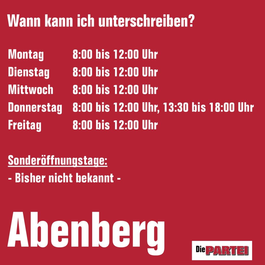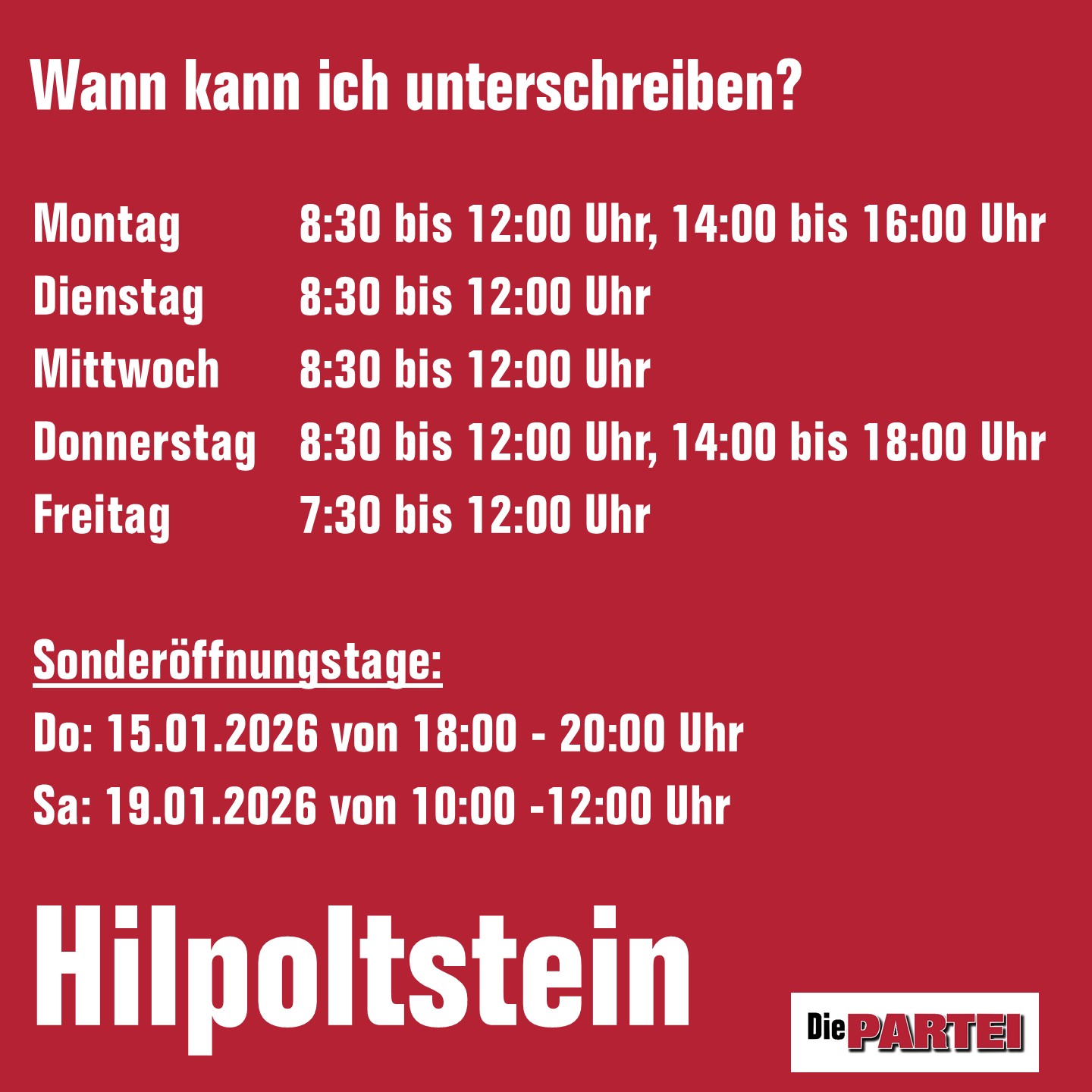 Um zur Kreistagswahl zugelassen zu werden brauchen wir insgesamt 385 Unterstützungsunterschriften. Damit das möglichst einfach ist, gibt das Gesetz eine Unterzeichnung im Rathaus der jeweiligen Heimatgemeinde vor. Wir haben dir alle Öffnungszeiten der Gemeinden zusammengefasst, jetzt musst du nur noch unterschreiben. Danke dir bereits jetzt!