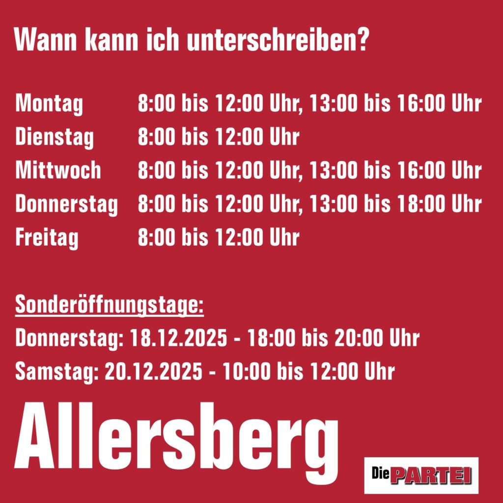 Für selbige sind wir sehr dankbar!“, so Christopher Müller. Inhaltlich bleibt die PARTEI bei ihrer bisherigen Ausrichtung, und möchte auch Themen aus der Stadtratswahl übernehmen: Politik für die Jugend, bezahlbarer Wohnraum, ökologische Kommunen, und: „Allersberg an