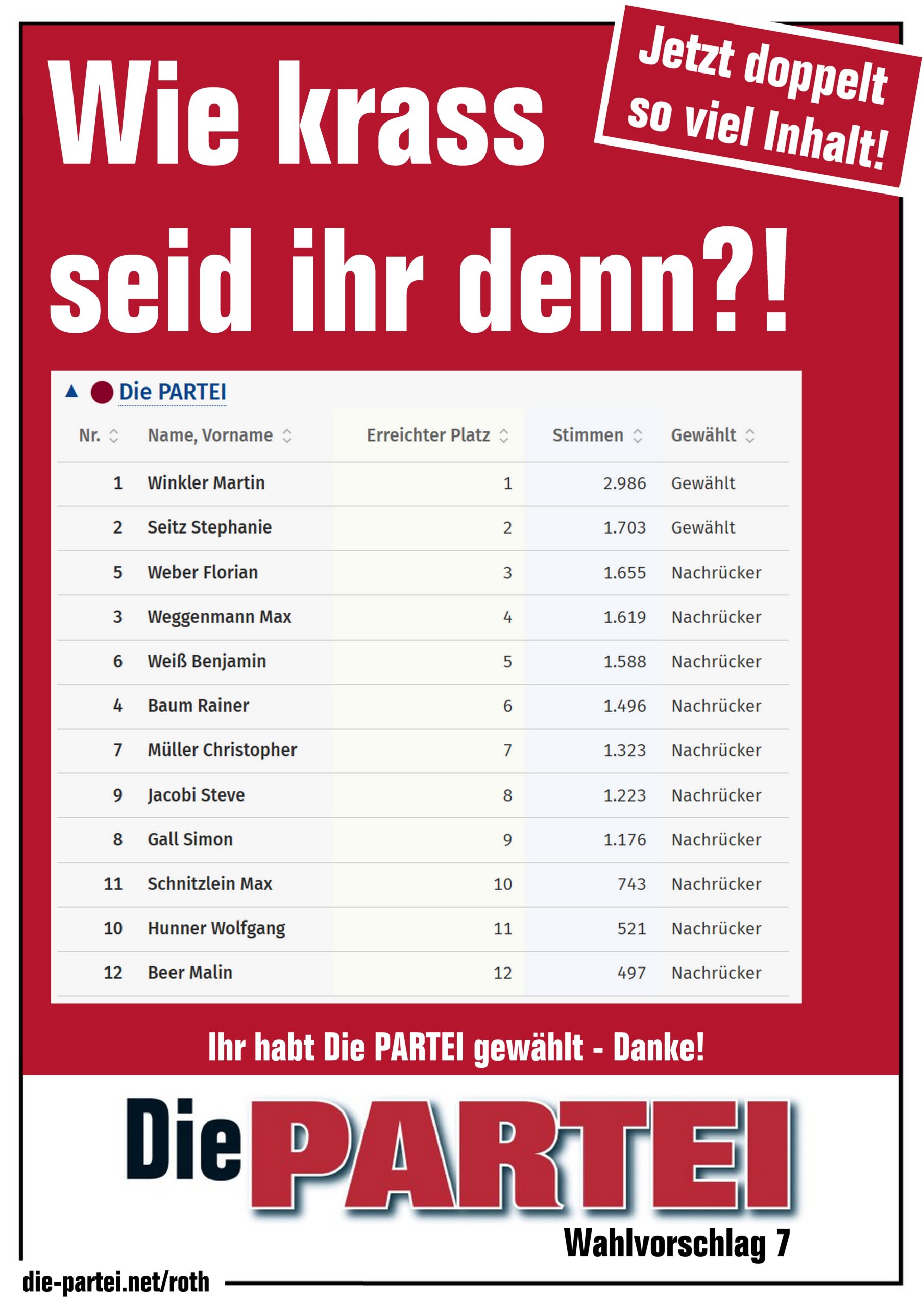 Auch in diesem Jahr lässt dich Die PARTEI am Unsinnigen Donnerstag (12.02.2026) in Spalt nicht hängen und ermöglicht es dir, kostenlos von Roth nach Spalt und zurück zu kommen. Ab 23:00 Uhr fahren im 20-Minuten-Zyklus drei Großraumtaxis zwischen Roth und Spalt die drei Haltestellen ab. Das Ganze ist kostenlos, es geht darum, dich sicher nach Hause zu bringen. Schau dazu einfach an den eingetragenen Abfahrtzeiten an deiner Haltestelle vorbei, sollte das Taxi voll sein, fährt 20 Minuten später wieder ein Neues. Mit dem neuen Konzept verbessern wir die Flexibilität zum Vorjahr, kleinere Fahrzeuge, die häufiger fahren mit einem zuverlässigen Partner.