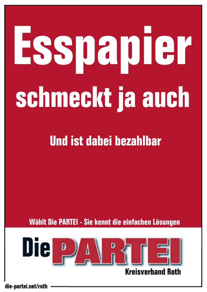 Ziel ist es, die Kosten für das Schüler*innenessen auf 3,00 Euro zu deckeln – die überschüssigen Kosten übernimmt die Stadt (und damit die Allgemeinheit). Unterzeichnen könnt ihr beim Genniges oder ihr ladet hier (https://die-partei.net/roth/files/2023/09/2023-Unterschriftenliste-Mittagessen-.pdf ) eine der Listen herunter und druckt diese aus. Die volle Liste dann gerne bei unserem Mandatsträger (Martin Winkler, Hauptstraße 35, 91154 Roth) einwerfen.