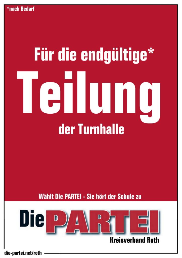 „Unser Auftrag ist die endgültige Teilung“, so hat es Sonneborn schon vor ein paar Jahren erkannt und geäußert. Nun haben wir uns im Stadtrat Roth dafür eingesetzt, dass dies endlich Realität wird. Dazu haben wir zusammen mit Die Linke einen Antrag gestellt, um die Turnhalle der Gartenstraße temporär teilbar zu machen. Damit müssen Schüler*innen für den Sportunterricht nicht mehr nach Pfaffenhofen gefahren werden und die Schule ist für die anstehende Viergliedrigkeit der Klassen gewabnet.