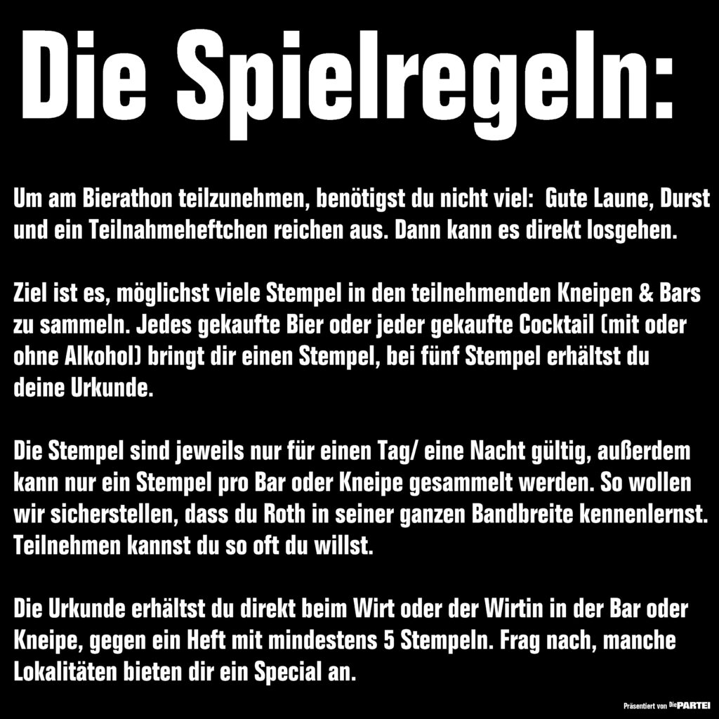 Der Bierathlon geht in die nächste Runde: Für die durch die Partei Die PARTEI organisierte Kneipenrallye in Roth können ab sofort wieder jederzeit Touren gestartet werden. Im Vergleich zum Vorjahr hat sich vor allem die Anzahl der Kneipen verändert, alles Weitere ist gleich geblieben. Weiterhin geht es darum, an einem Abend fünf Getränke in den teilnehmenden Kneipen und Bars von Roth zu trinken. Als Ehrung winken eine Urkunde und die Bereicherung, das Nachtleben in Roth noch einmal von einer anderen Seite kennengelernt zu haben.
