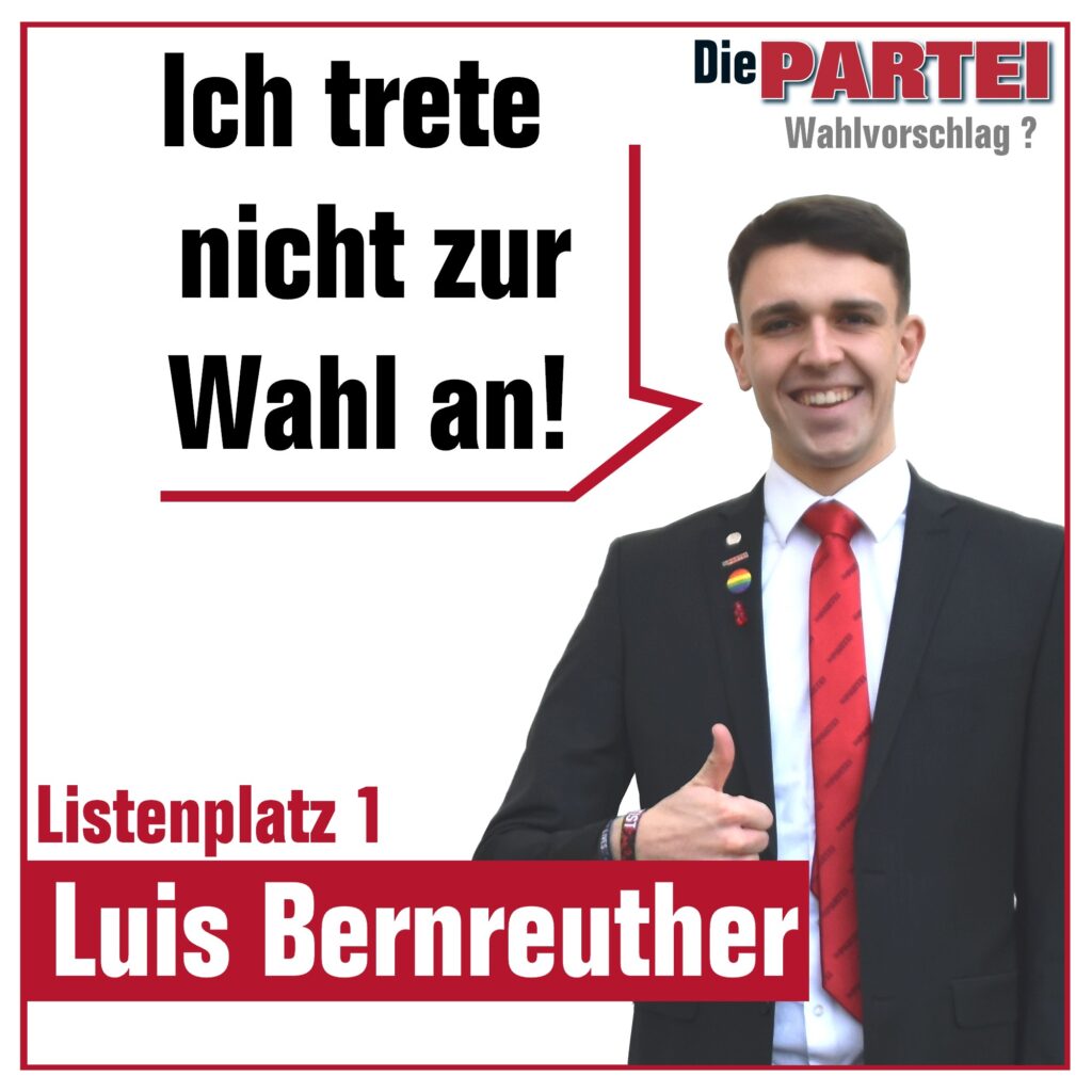dabei nicht nur Stadtrat und Bürgermeister, sondern auch der Kreistag. Der Kreisverband Roth der Partei Die PARTEI stellte deshalb bei seiner Aufstellungsversammlung am 16.08.2025 nicht nur eine 12-köpfige Liste für den Rother Stadtrat auf (siehe Pressemitteilung vom 12.10.2025), sondern auch eine – sogar noch längere, ebenso hochkarätig besetzte – Kreistagsliste. Angeführt wird sie vom 1. Kreisvorsitzenden Luis Bernreuther aus Georgensgmünd, der sich, für die PARTEI typisch satirisch, (wahl-)kampfbereit zeigt: