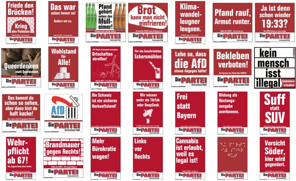 Hilf mit und werde selbst Teil des Kreisverband Roth! Setz dich dazu doch einfach mit uns in Verbindung, z.B. über das Kontaktformular der Seite. Oder werde Mitglied unter: https://www.die-partei.de/mitgliedsantrag/