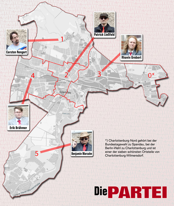 Daher geben wir Euch die fantastische Chance, uns zu helfen. Bevor wir nämlich die Macht übernehmen können, gibt es diese völlig absurde Hürde, dass genügend Menschen damit einverstanden sein müssen. Und die Chance müssen wir ihnen bieten, also müssen wir folglich auf den Wahlzettel und versprechen Euch eine Wahl, für die Ihr Euch bedanken werdet. Auf der Karte seht Ihr die Wahlkreise für die BVV, das Abgeordneten-Haus und der gesammte Ausschnitt ist der Bundestagswahlkreis. Ladet Euch je nach Eurem Wohnort das entsprechende pdf runter, füllt alles aus und schickt es an: Die PARTEI, Kopischstr. 10, 10965 Berlin. Pro-Tipp: ab 5 Unterschreibern vereinbaren wir auch gern eine persönliche Abholung und vergessen gelegentlich Sticker und Plakate.