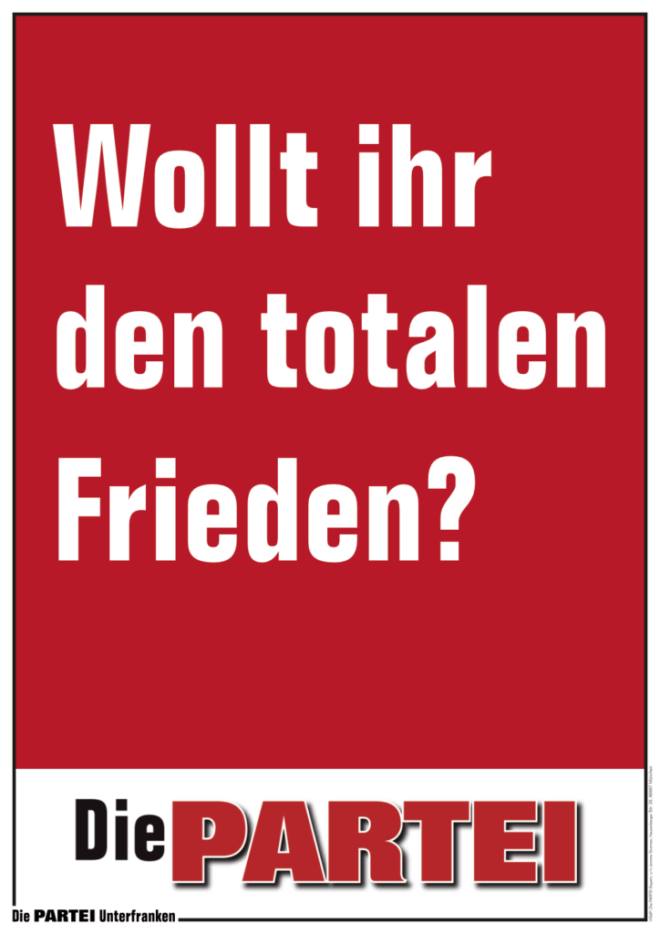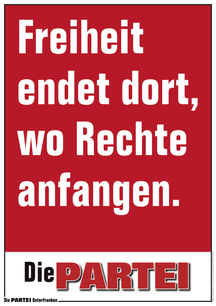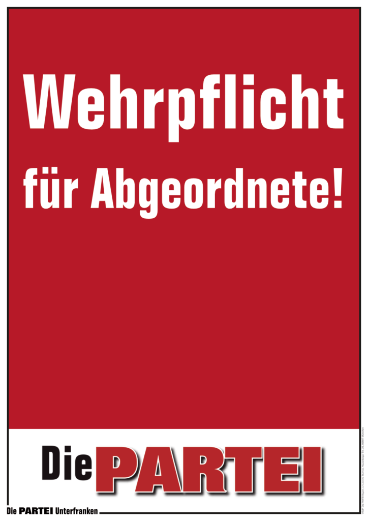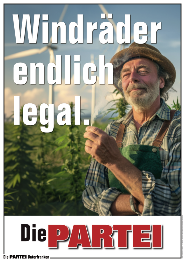 Wir plakatieren zum perfekten Zeitpunkt: jetzt noch. Gut möglich, dass wir am 25. und 26.05. unterwegs sind, oder später. Wenn du Zeit hast, und schon immer mal ganz entspannt (weil legal) trotzdem coole Motive (weil Die PARTEI) plakatieren wolltest: Melde dich bei Vorstand Die PARTEI Unterfranken Wenn nicht, steh am Wegesrand und huldige uns, halte kühles Bier bereit oder sei in Gedanken bei uns. Und verbreite Fotos unserer Motive online.