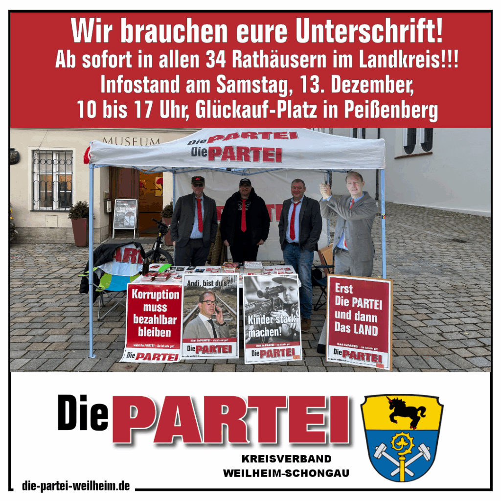 Überzeugt euch selbst davon: Am Samstag, 15. November, stehen wir mit unserem sehr guten Infostand auf dem Marienplatz in Weilheim. Die PARTEI-Kandidaten für den Kreistag und ich werden dort um Unterschriften betteln und das Wahlvieh mich reichlich Geschenken ausstatten. Vom Flyer über den Sticker bis zu Omas Socke ist alles im Angebot. Kommt vorbei, zwischen 10 und 17 Uhr zerstören wir das Stadtbild!!!!!