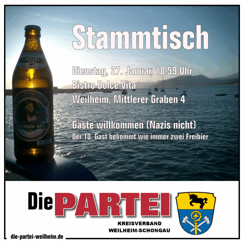 Damit es beim Stammtisch auch was zu Feiern gibt: Wer es noch nicht getan hat, geht diese Woche bitte unbedingt noch ins Rathaus und unterschreibt für uns (Landrat und Kreisrat), damit wir bei der Kommunalwahl antreten dürfen (Personalausweis nicht vergessen). Nächste Woche ist es zu spät …