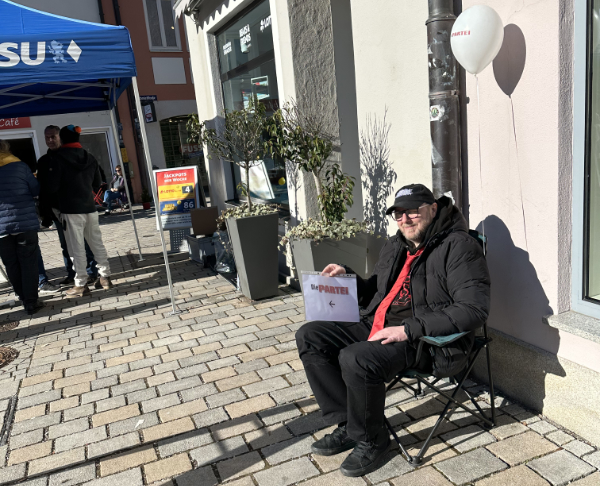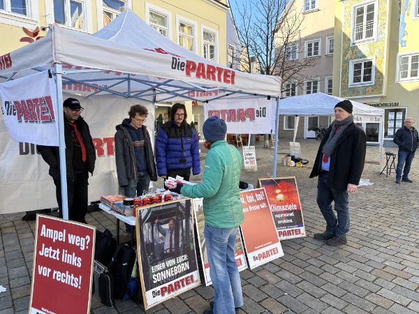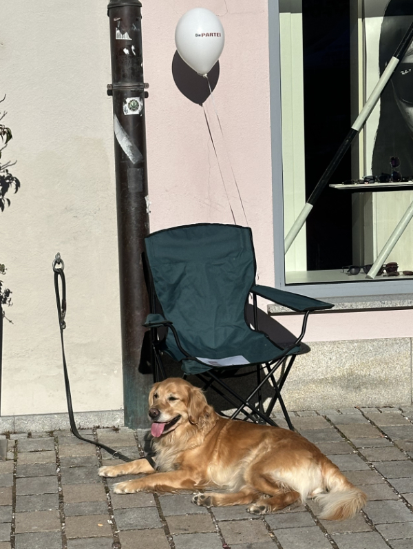 Brutal erfolgreich absolvierte der sehr gute Kreisverband der Partei Die PARTEI am vergangenen Samstag seinen ersten Infostand zur Bundestagswahl in Weilheim. Und das, obwohl die Wahlkampfveranstaltung mit einer schreienden Ungerechtigkeit begonnen hatte: Während die blöde CSU auf der Sonnenseite des Marienplatzes ihren Stand aufbauen durfte, hatte man uns den Platz im Schatten zugewiesen – in frostiger Nachbarschaft zu Voldemords Jüngern von der AfD. Natürlich platzierten wir einen PARTEI-Stuhl neben der CSU, der dem Wahlvieh den richtigen Weg zu uns wies. Während wir uns im Laufe des Tages abwechselnd auf dem Stuhl in der Sonne aufwärmten, warben wir nebenbei der CSU ihren Kampfhund ab, der fortan unseren Stuhl bewachte und sich streicheln ließ.
