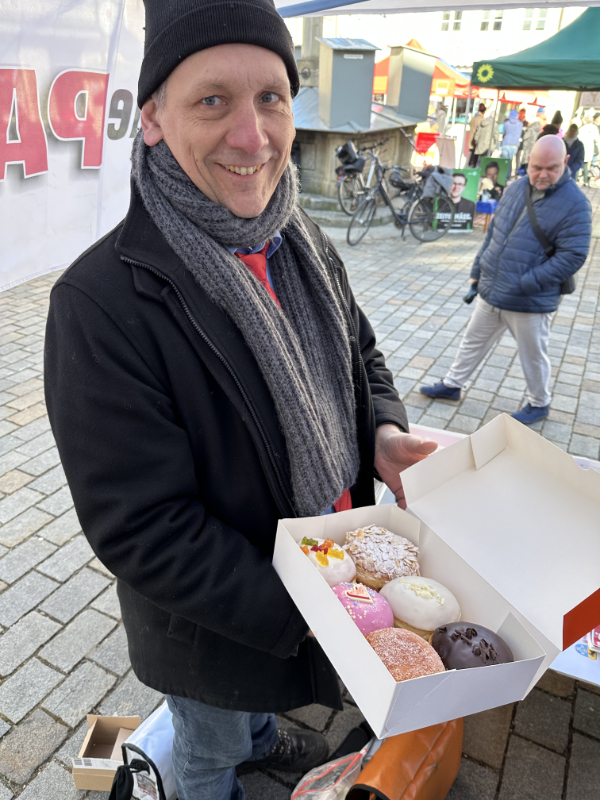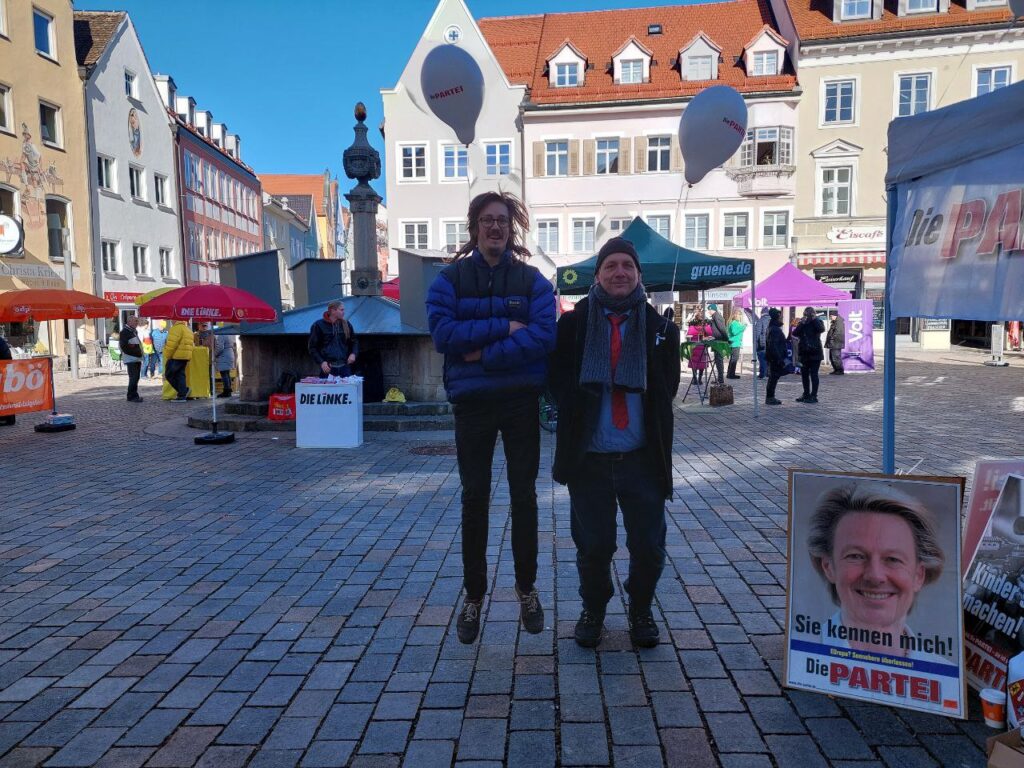 Im Schatten erwärmten uns derweil die vielen Sympathie-Bekundungen der Besucher, die Sticker abgriffen wie der Pauschalurlauber das Buffet. Landespapa Roland Kronbauer lockte das Wahlvieh an den Stand und ließ sich sogar von einem Grünen-Politiker zu einem Selfie überreden. Auch das regionale Wahlprogramm ging weg wie warme Semmeln, die endgültige Trennung des Landkreises Weilheim-Schongau ist also nur noch eine Frage der Zeit. Der örtliche Montagsläufer (er wanderte neuerdings am Dienstag) schaute ebenfalls vorbei und berichtete von seinem harten Leben, Kinder hüpften glücklich mit PARTEI-Luftballons über den Marienplatz, der Landspapa spendierte uns Krapfen und Brezen, das Bier war kalt. Weilheim war für wenige Stunden ein besserer Ort.