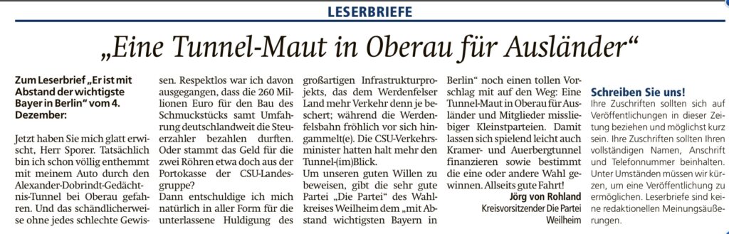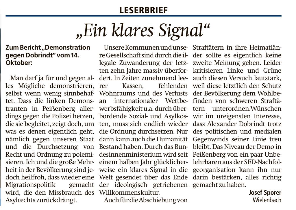 Das geht natürlich gar nicht: Da demonstriert doch glatt ein linker Mob Jugendlicher gegen den unfehlbarsten aller Innenminister. Und das mitten in seinem Heimatort!!! (hier geht’s zum Bericht im Merkur). Natürlich springt Alexander Dobrindt untertänigst sein größter Fan aus Wielenbach zur Seite: Hier geht’s zum Leserbrief vom Sporer Sepp, den wir natürlich nicht unkommentiert ließen …