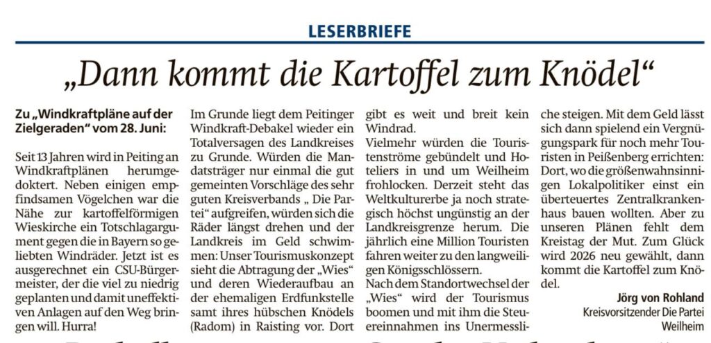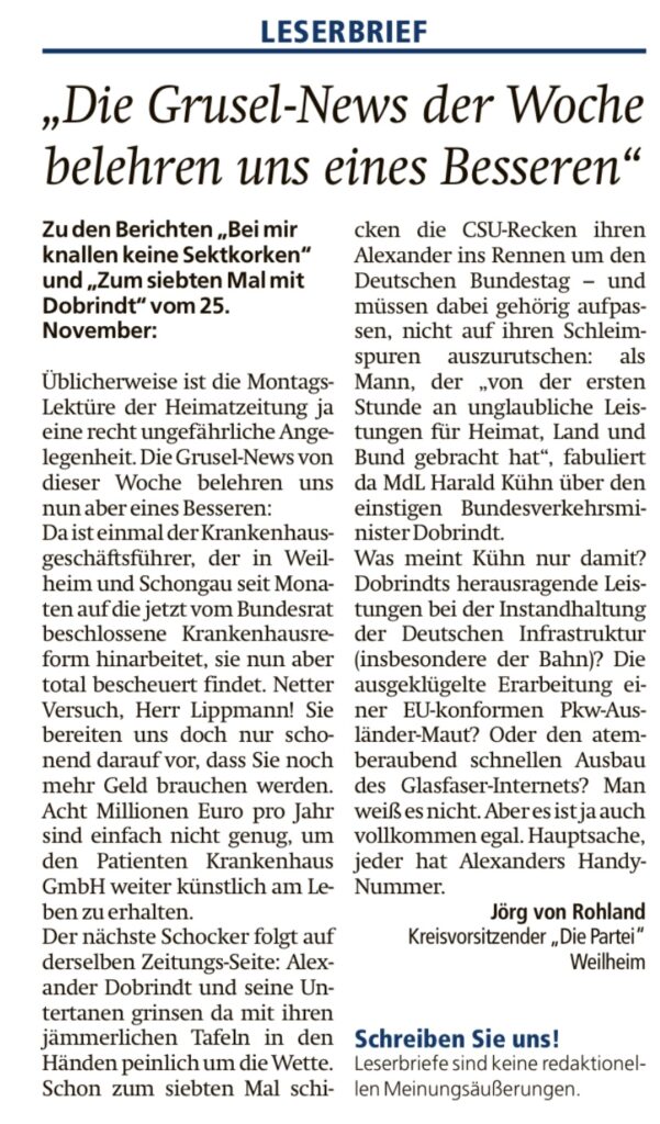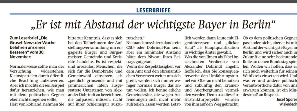 Leserbriefe zu den Merkur-Artikeln vom 24.11.2024: Zum siebten Mal mit Alexander Dobrindt in die Bundestagswahl +++ Krankenhaus-Chef kritisiert Lauterbach-Reform: „Bei mir knallen bestimmt keine Sektkorken“ +++ Bürgerentscheid in Ingenried: Klarer Sieg für Photovoltaik-Gegner und die Antwort der CSU (aus Wielenbach):