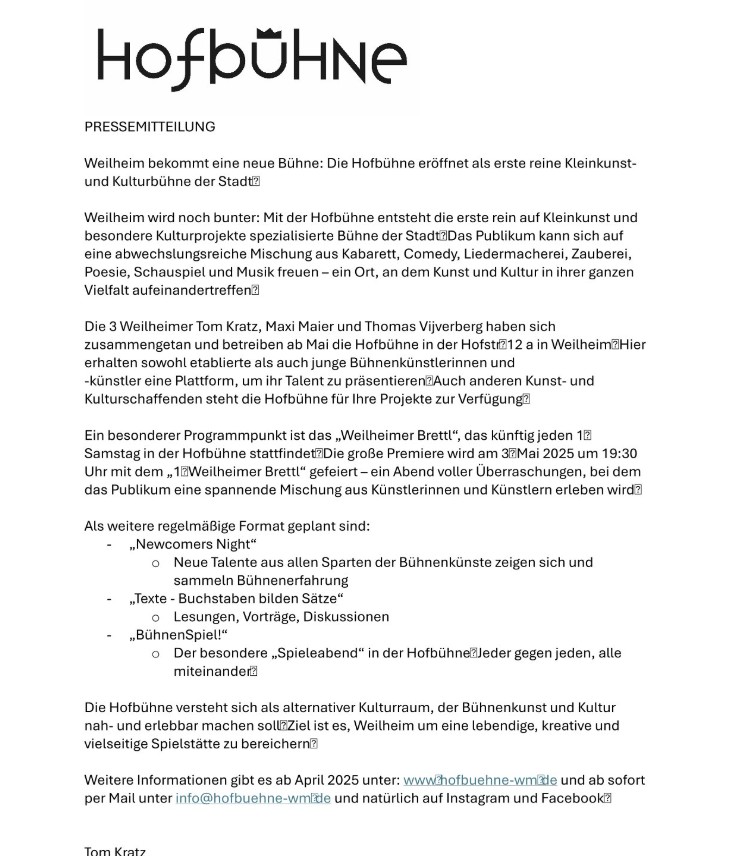 25. März 2025: Endlich einmal eine positive Nachricht aus Weilheim: Nachdem der Eigentümer das Starlightkino lieber an die FCKAFD vermietet (siehe auch Kackmops des Monats), statt der Kleinkunst neuen Raum zu geben, entsteht trotzdem eine neue Bühne in der Kreisstadt. Wir sind gespannt!