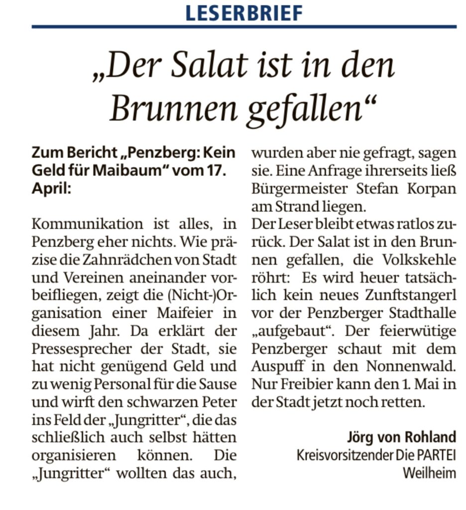 Das Maibaum-Aufstellen ist eine Kunst, in Penzberg eine noch Größere. Dieses Jahr ist gar nichts draus geworden: https://www.merkur.de/lokales/weilheim/penzberg-ort29272/feier-penzberg-kein-geld-fuer-maibaum-93687678.html