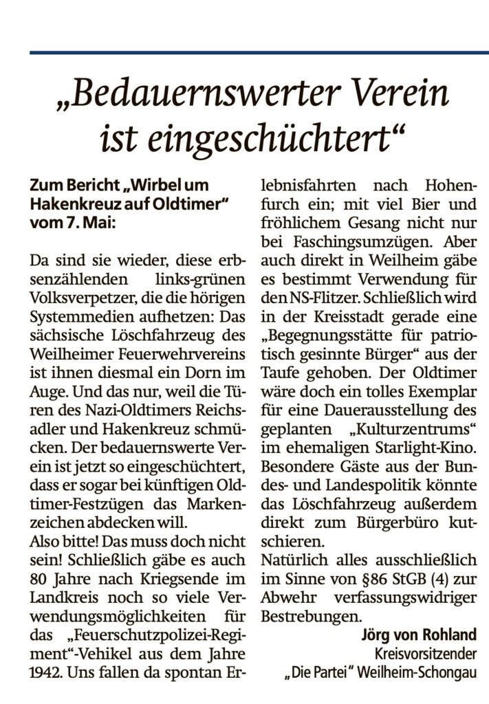 Ein ganz besonderes Vehikel gab es beim Umzug zum Peißenberger Feuerwehrjubiläum zu bewundern. Ein Fahrzeug aus dem Jahr 1942 samt Reichsadler und Hakenkreuz. Die Aufregung war groß: https://www.merkur.de/lokales/weilheim/weilheim-ort29677/weilheim-peissenberg-wirbel-um-hakenkreuz-auf-oldtimer-93717733.html