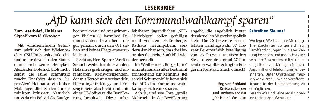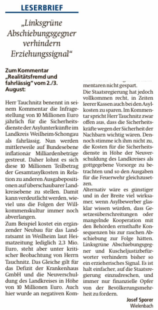 Also Herr Tauchnitz, jetzt schlägt’s aber 14! In welcher links-grün-versifften Hippie-Kommune haben Sie denn bitte gefrühstückt, bevor Sie diesen CSU-feindlichen Kommentar verfasst haben?! Bei der Lektüre Ihres Pamphlets ist dem armen Sporer Josef vor Schreck bestimmt die Weißwurst von der Gabel geplumpst! Was sie da schreiben, passt so gar nicht in sein Deutschlandbild, das „der mit Abstand wichtigste Bayer in Berlin“ (Sporer über Bundes-Innenminister Dobrindt) aus Peißenberg gerade neu formt. Schluss mit der Willkommenskultur! Die zehn Millionen Euro, die im Landkreis zum Schutz der Bewohner in Asylbewerberunterkünften ausgegeben werden, sind keine „gottgegebene Vorsorge“, meint der Wielenbacher CSU-Chef. Rasche Abschiebungen und Maulkörbe für „Kuscheljustizbefürworter“ reichen aus! Sollen die Mütter und ihre Kinder in den Einrichtungen doch selbst schauen, wie sie mit (einzelnen) Gewalttätern zurechtkommen!