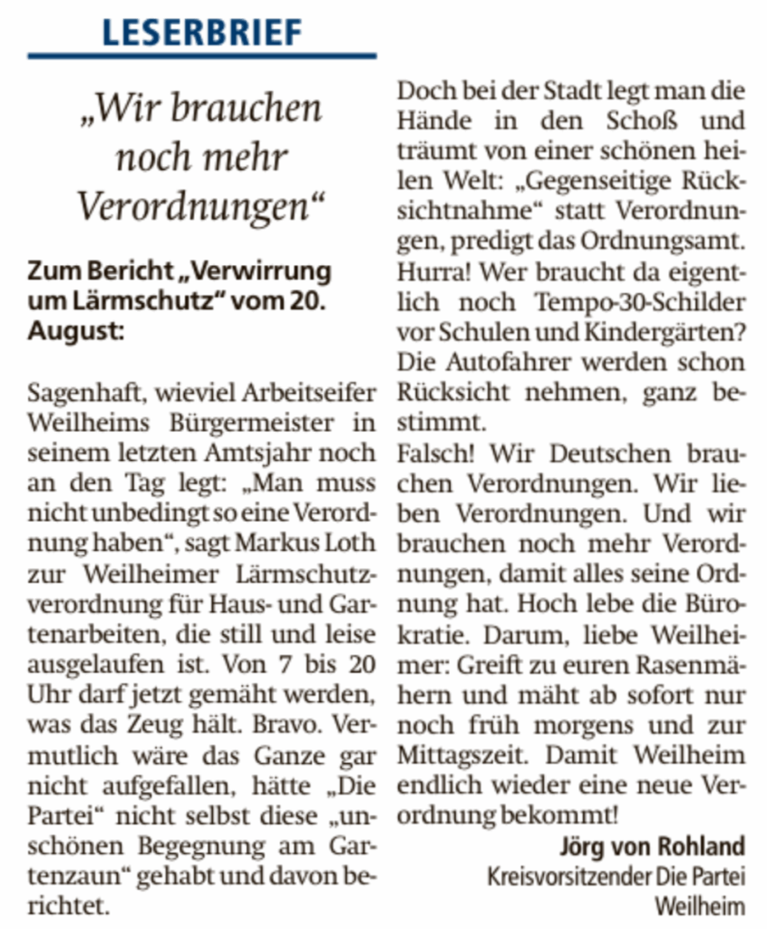 So nicht! Wir wollen Verordnungen, weil der Deutsche Verordnungen liebt. Wäre ja noch schöner! Also Weilheimer, ran an die Rasenmäher, damit Weilheim endlich wieder eine neue Verordnung bekommt!