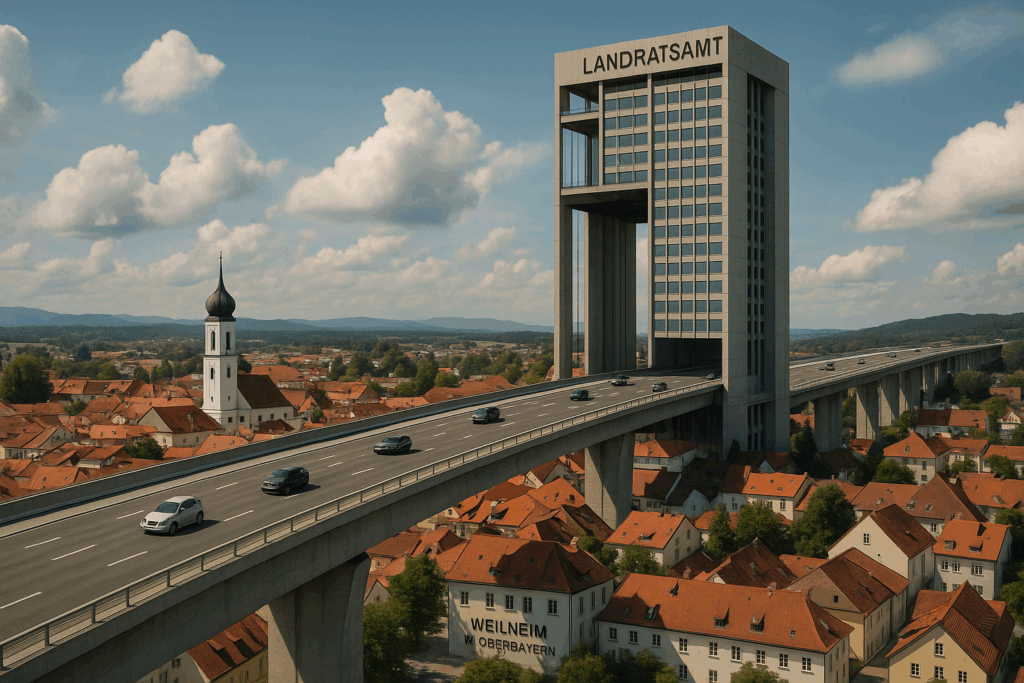 Das Gejammere der Landratsamts-Verantwortlichen ist kaum mehr zu ertragen: Zu wenig Platz, zu viele Standorte, zu viel Arbeit. Jetzt wollen die Beamten an ihr Dienstgebäude in Weilheim einen hässlichen Kasten anbauen und munter weiter Flickschusterei betreiben. Schluss damit! Wir haben auch hier die perfekte Lösung: Das ganze landkreiseigene marode Immobilien-Gerümpel wird an gierige Investoren verkauft. Weil unter den Häusern auch ein Schloss ist (Schongau) werden die Verkaufserlöse unermesslich sein. Damit lässt sich spielend leicht ein Landratsamts-Hochhaus in Weilheim finanzieren, das von trendigen Architekten gekonnt in die Überfahrung (siehe oben) integriert wird. Kraftfahrer haben in Zukunft so die Möglichkeit, die Kfz-Zulassungsstelle direkt über einen Drive In zu erreichen und müssen nicht aussteigen. Ist das nicht geil?! Geplant werden 30 Stockwerke, die obersten zwei sind dem Landrat/der Landrätin vorbehalten: mit einem feudalen Penthouse samt Infinity Pool auf der Dachterrasse (Alpen- sowie Blick auf Starnberger und Ammersee inklusive). Wer hart arbeitet, braucht schließlich auch ein Mindestmaß an Erholung!